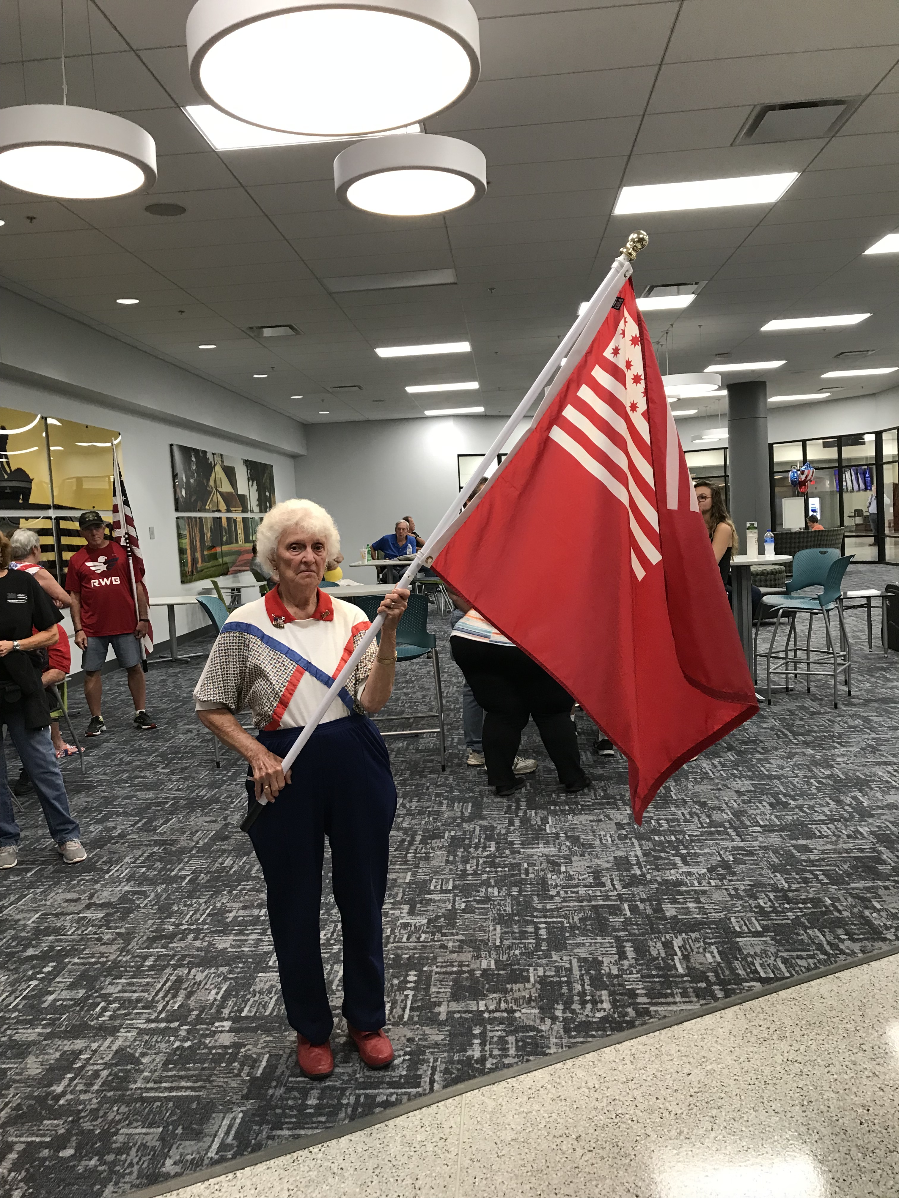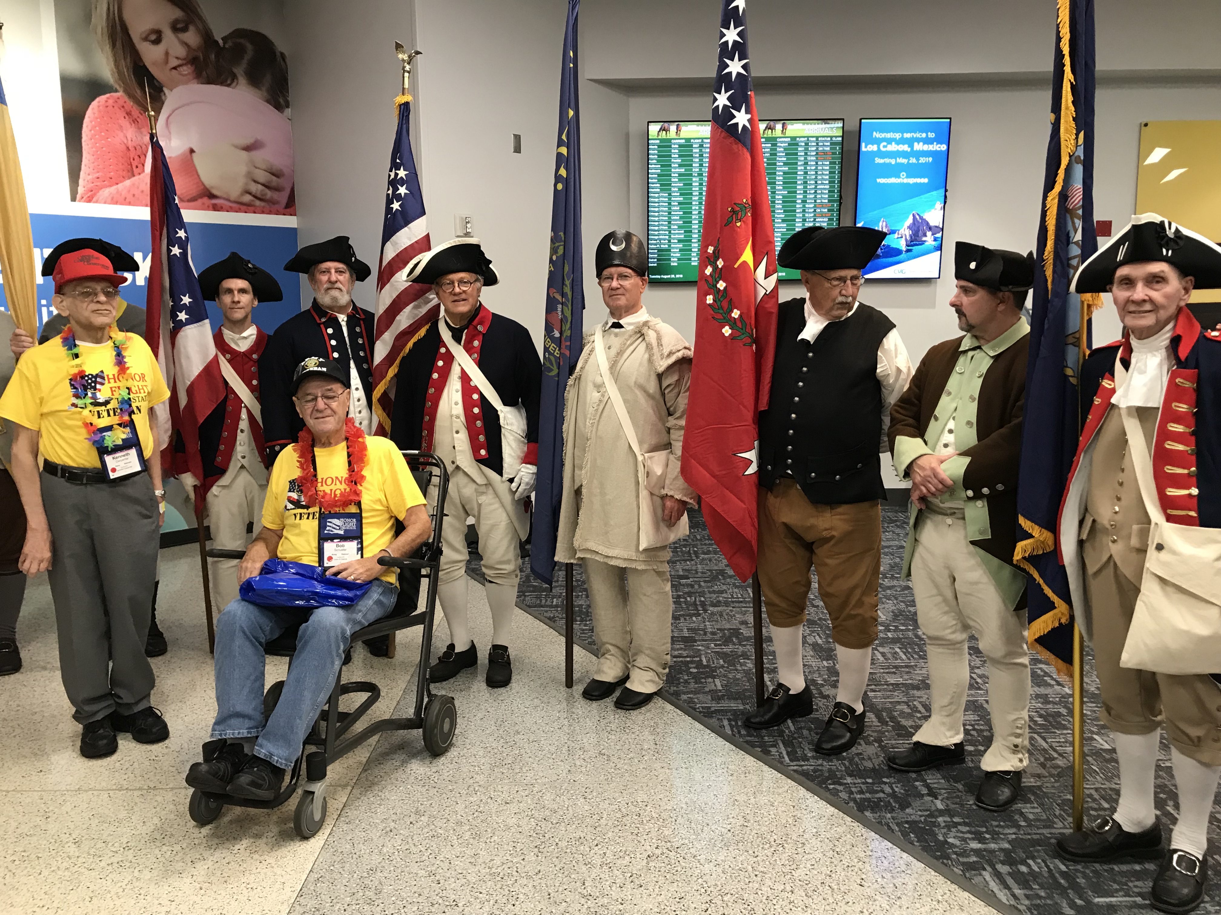 Compatriots of the Cincinnati SAR welcomed home another Tri-State Honor flight on Tuesday, August 28th at CVG. This flight was particularly special to the Cincinnati Chapter because Compatriot Ken Carpenter was on board! Cincinnati Compatriots welcoming Ken’s return were: Gary Duffield, Lee Wilkerson, Clay Crandall, Mike Gunn, George Stewart, Ed Bonniwell, Bob Bowers, Mike Blum, Brad Jarard, Shaun Smith, Larry Collins, Gregg Ballman, Dan Schmitz, Jack Bredenfoerder along with Ken’s wife Carolyn and children Henry and Jennifer. Welcome home Ken!